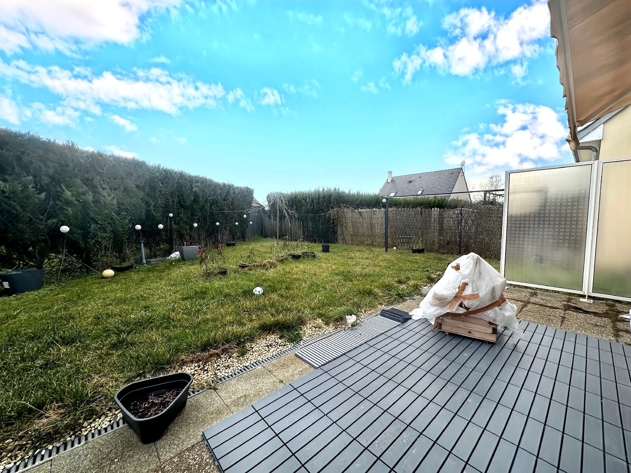 - A l'arrière : un jardin avec petite terrasse, accessible par le salon.