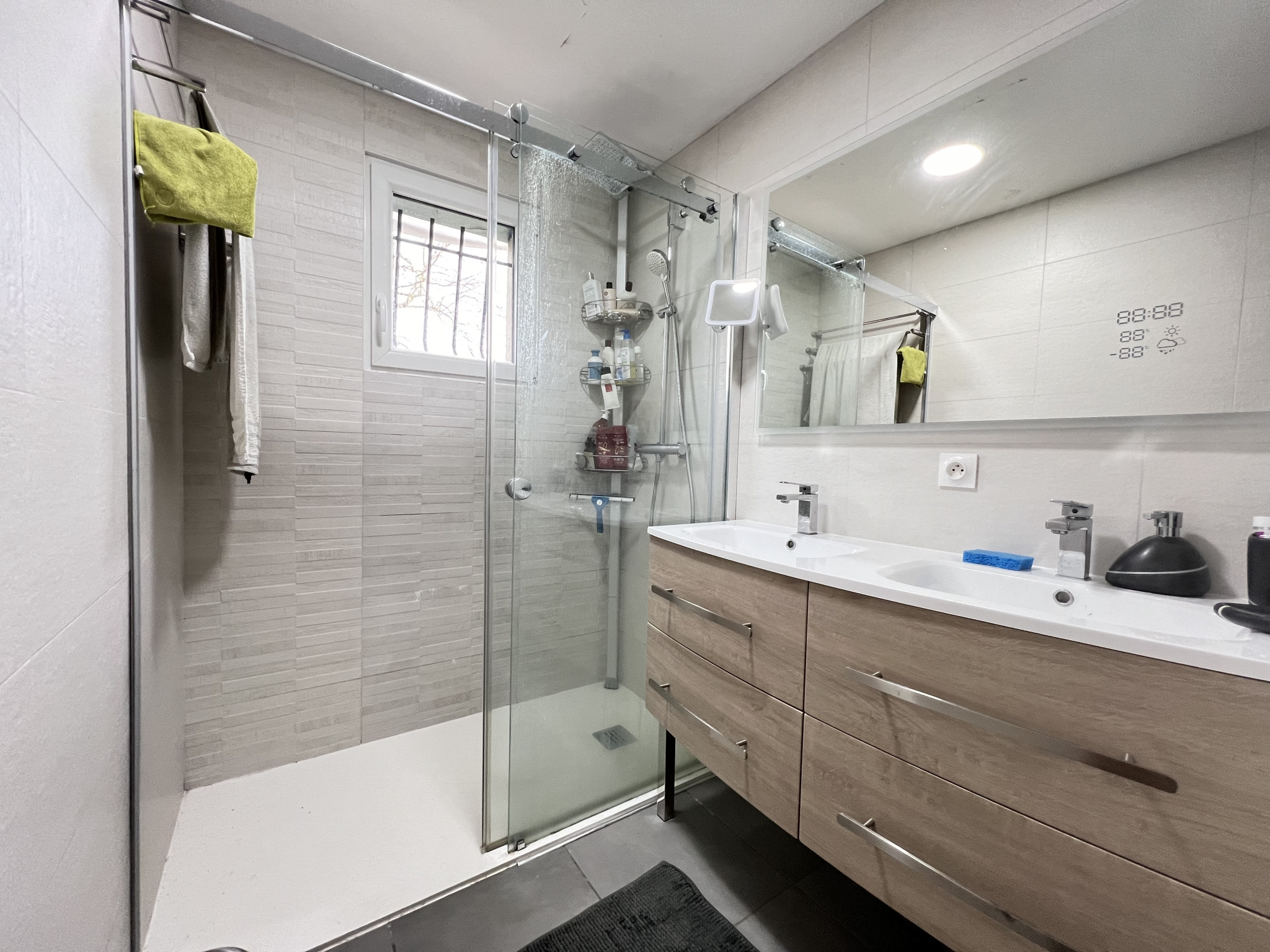 Le rez-de-chaussée comprend un salon/séjour avec cuisine ouverte aménagée équipée d'environ 41 m², deux chambres dont une avec dressing, une buanderie, un wc indépendant, une salle d'eau avec douche à l'italienne et un petit garage.