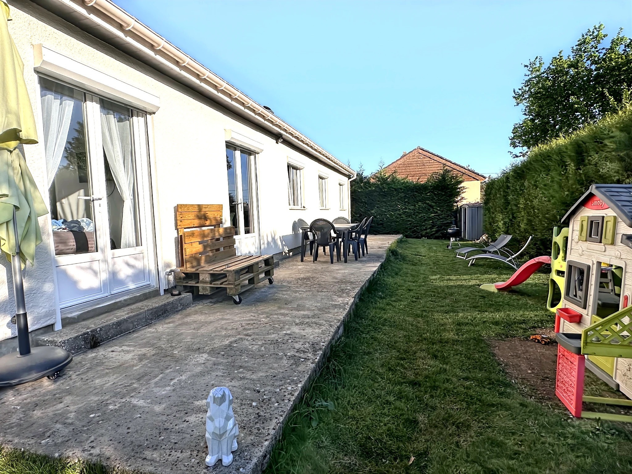 - Terrasse à l'arrière de la maison, idéale pour les repas en extérieur ou les moments de détente