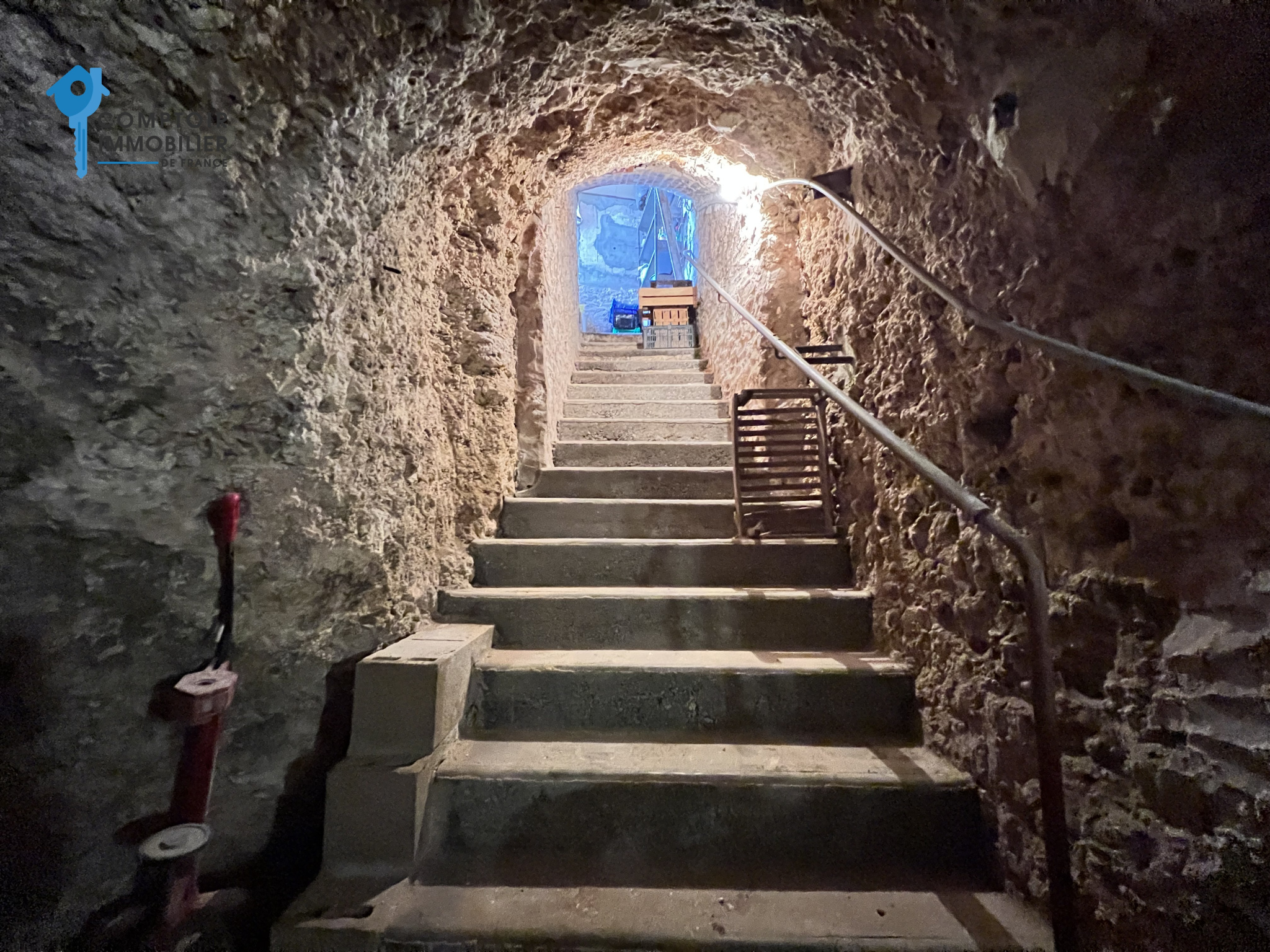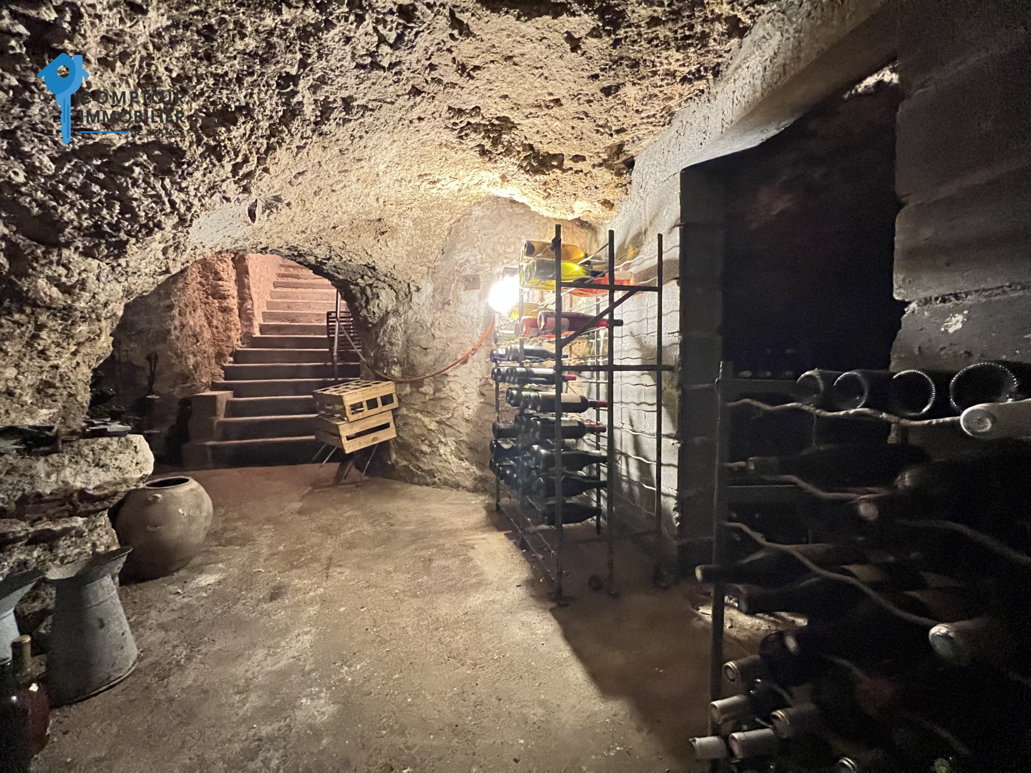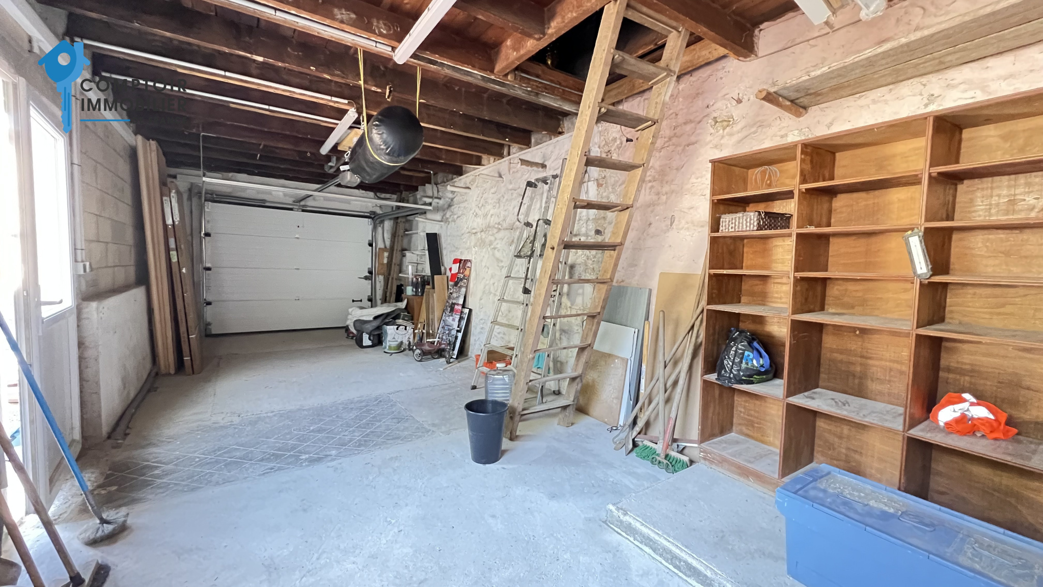 Côté extérieur, sur l'avant de la maison, vous profiterez d'un grand garage, deux petites dépendances, une grande cour pouvant stationner les véhicules ainsi qu'une magnifique cave voutée.