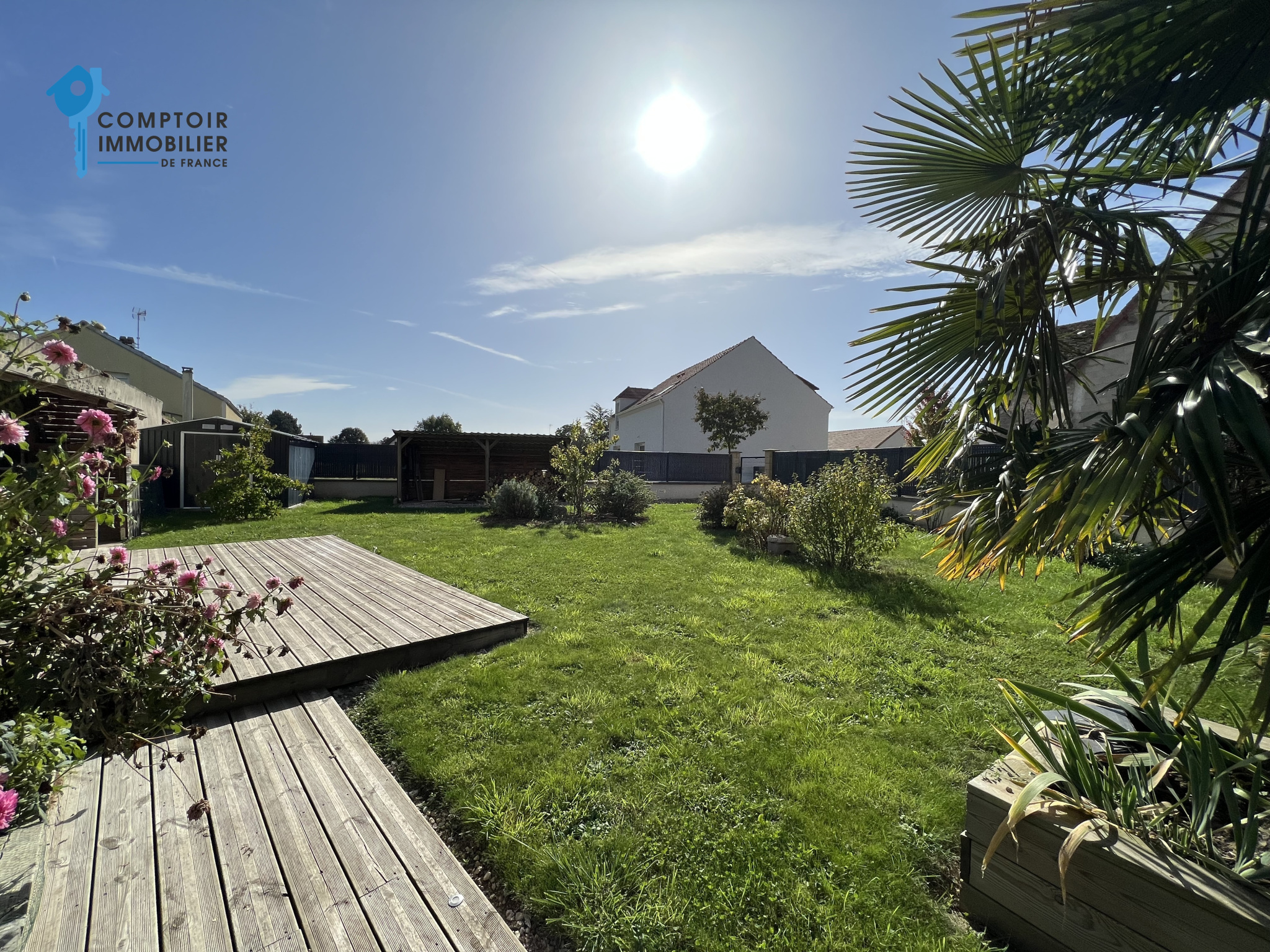 L'arrière de la maison dispose d'un beau jardin clos et arboré avec sa terrasse en bois, un abris de jardin et un bucher.