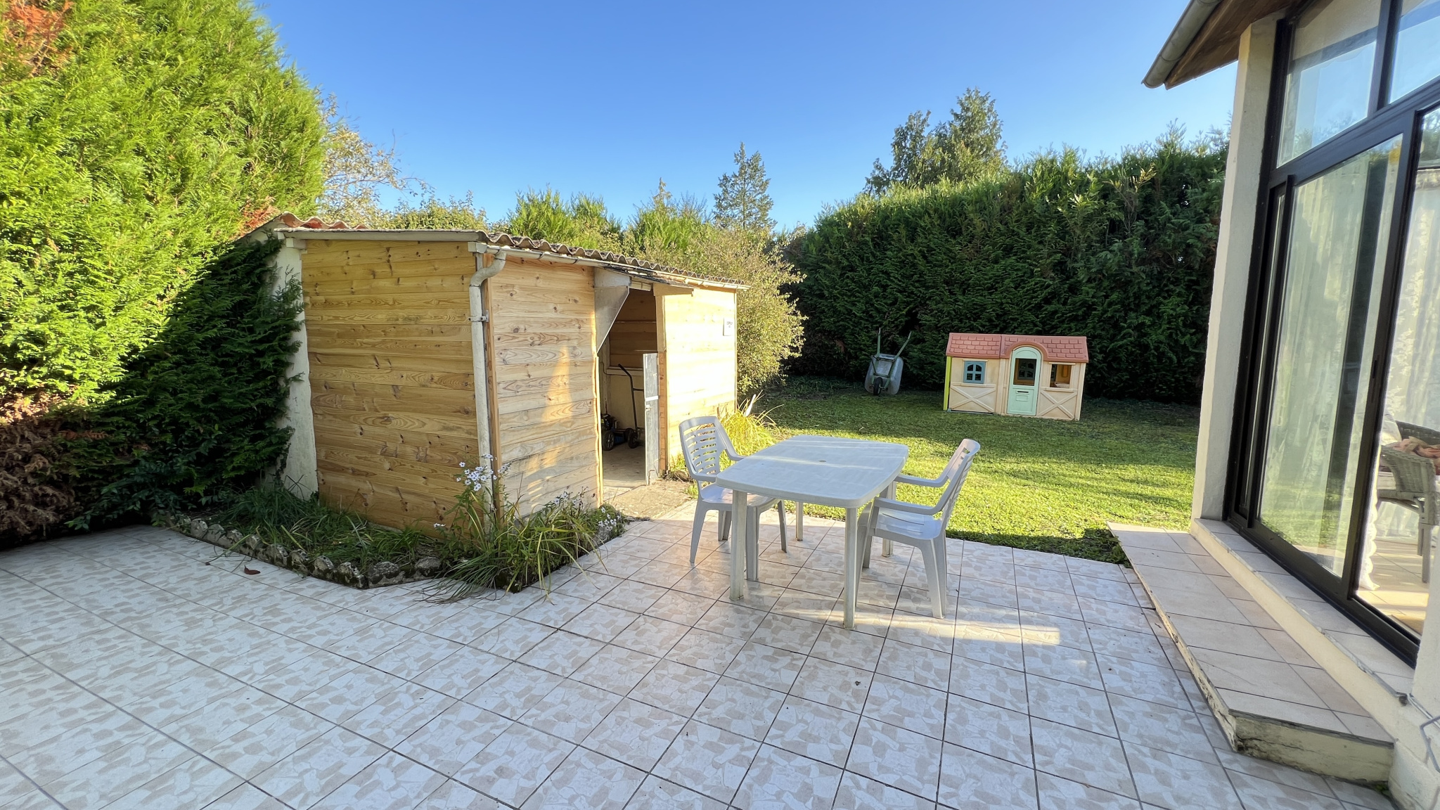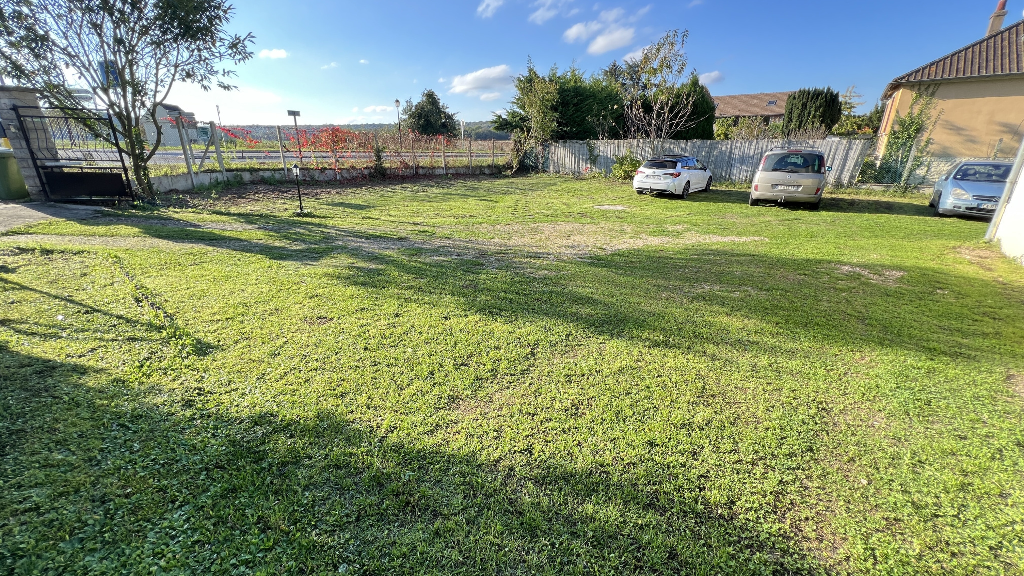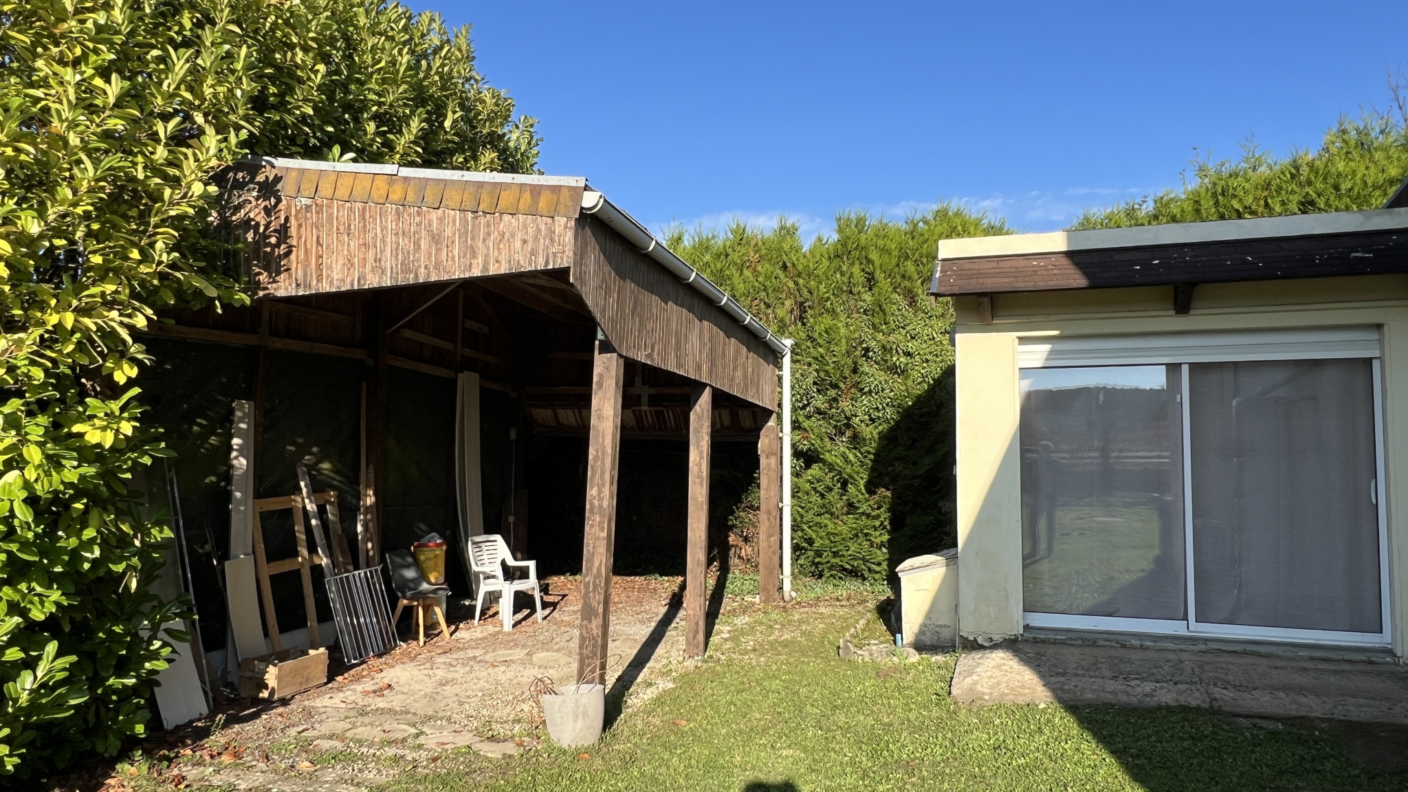 Terrain clos d'environ 932m2 (divisible) avec abri de jardin et carport pour voiture.