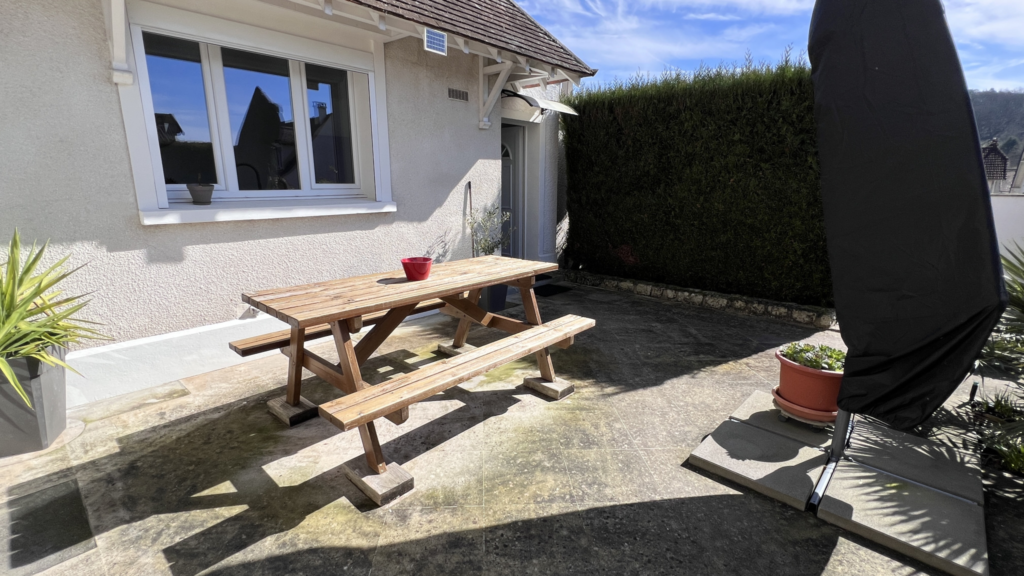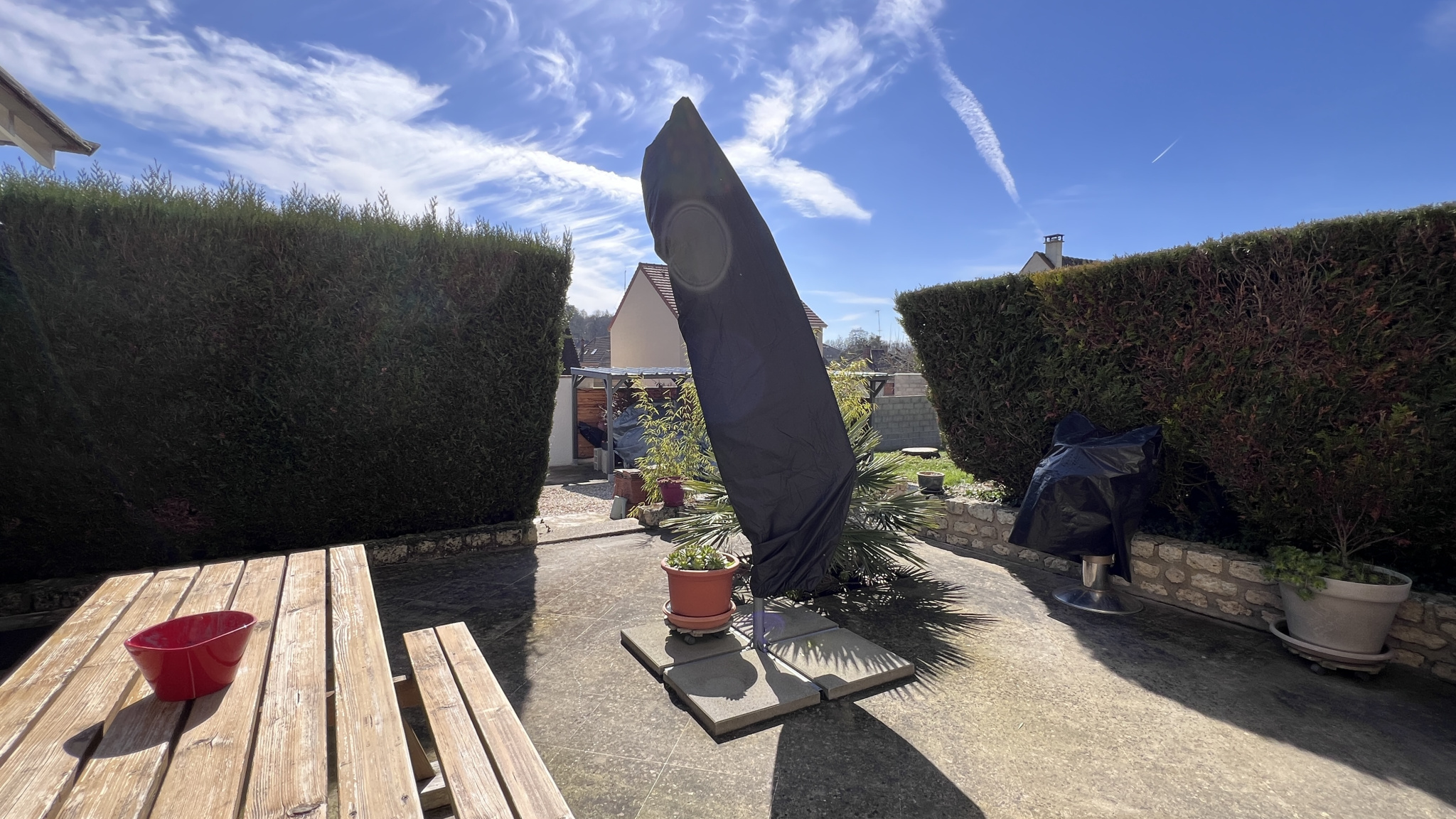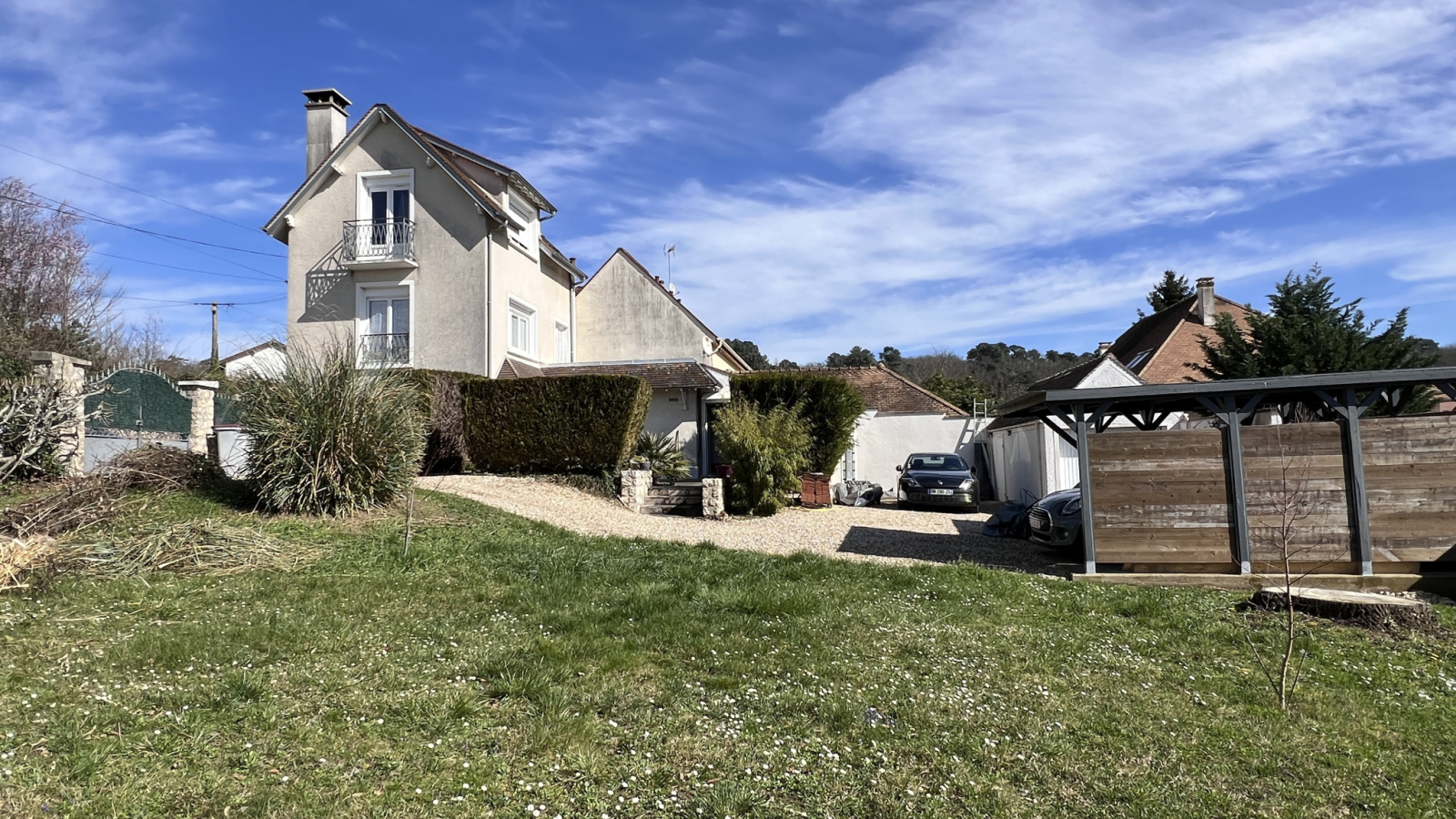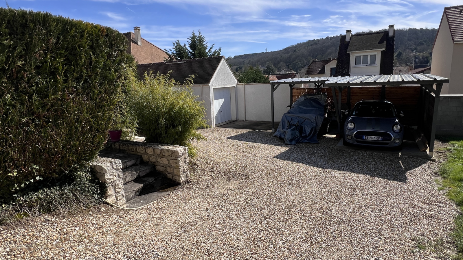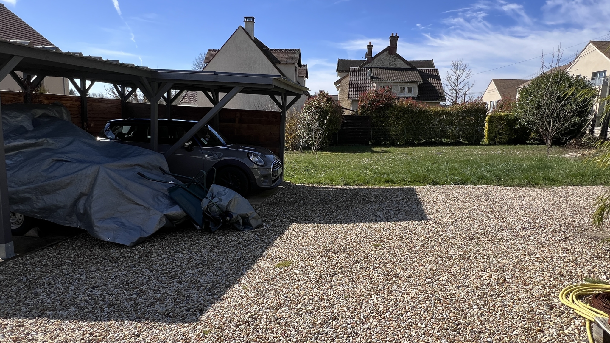 Très beau jardin d'environ 600m2 avec carport pour deux véhicules et un garage.