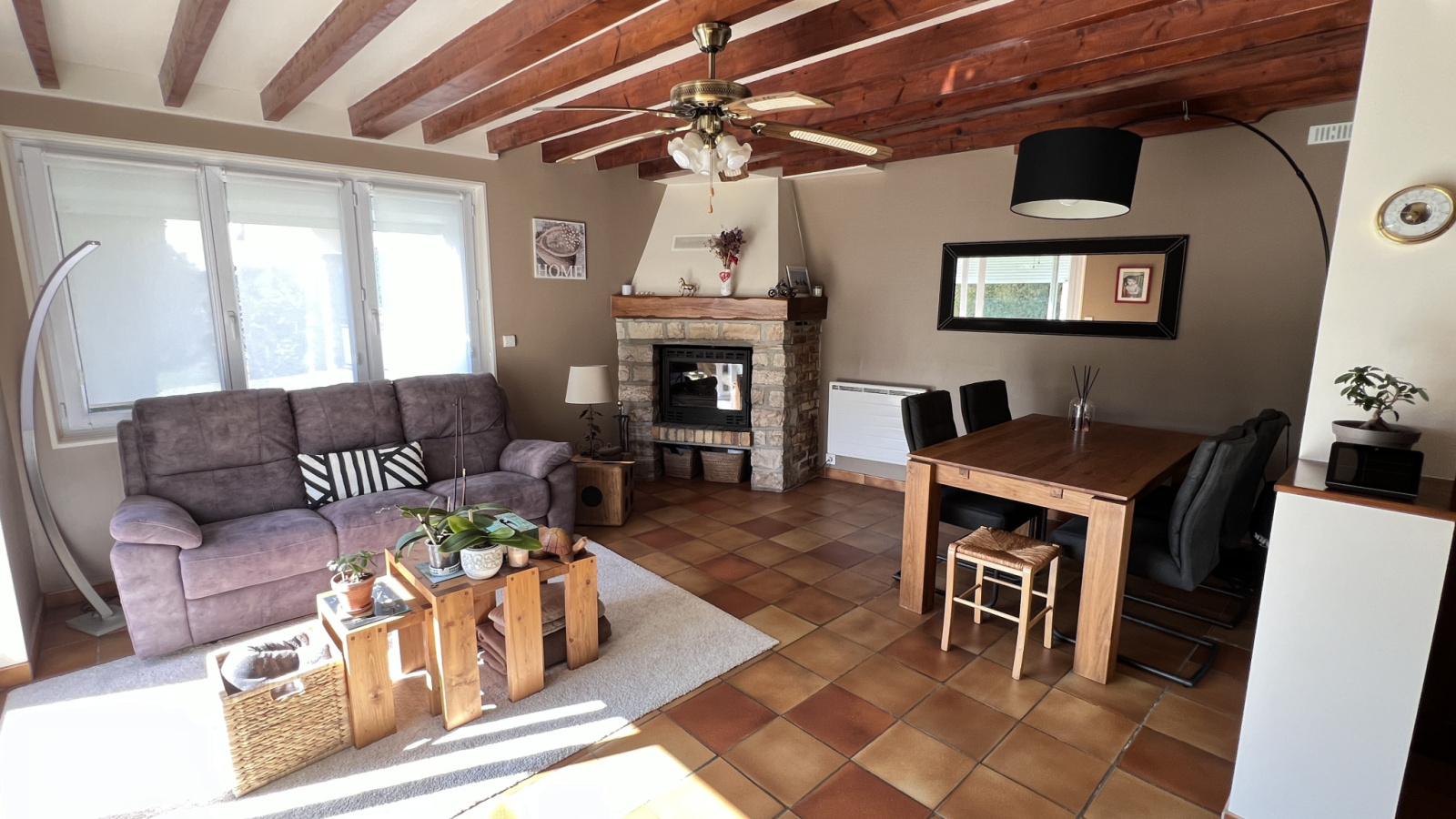 Au rdc, vous disposerez d'une entrée avec un coin buanderie, d'une belle cuisine aménagée et équipée, un séjour/salon avec cheminée/insert ainsi qu'un wc.