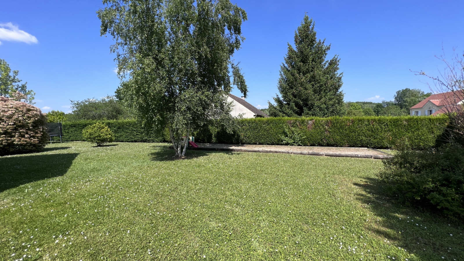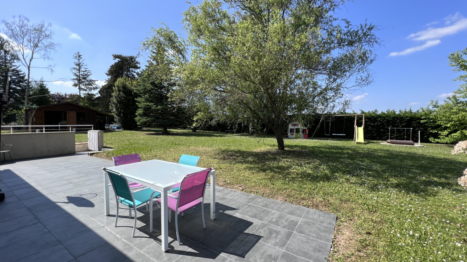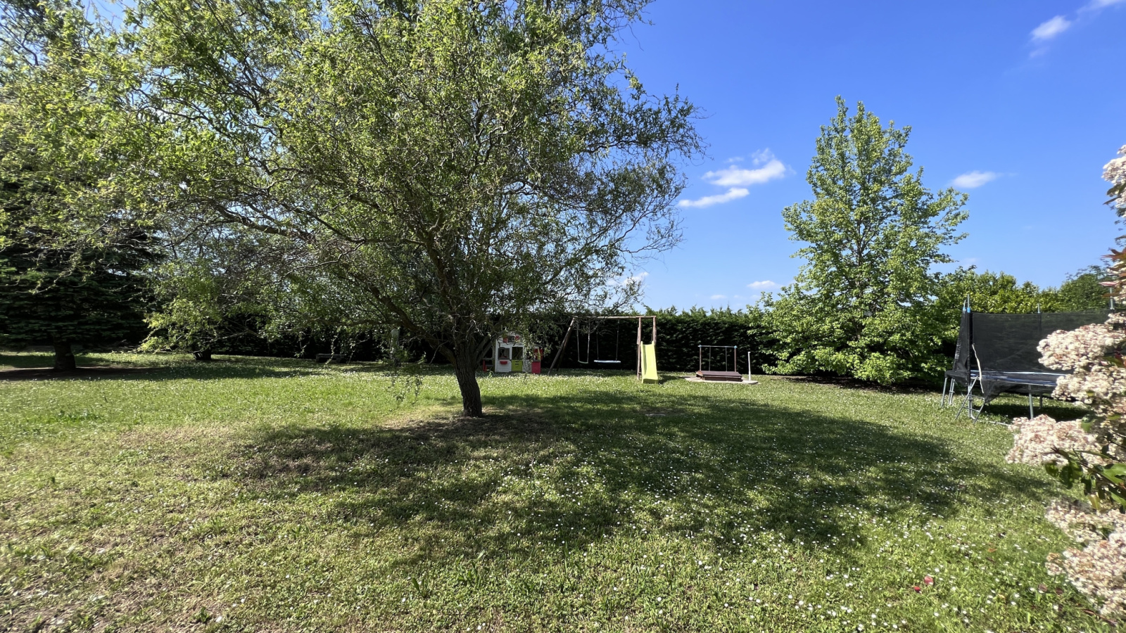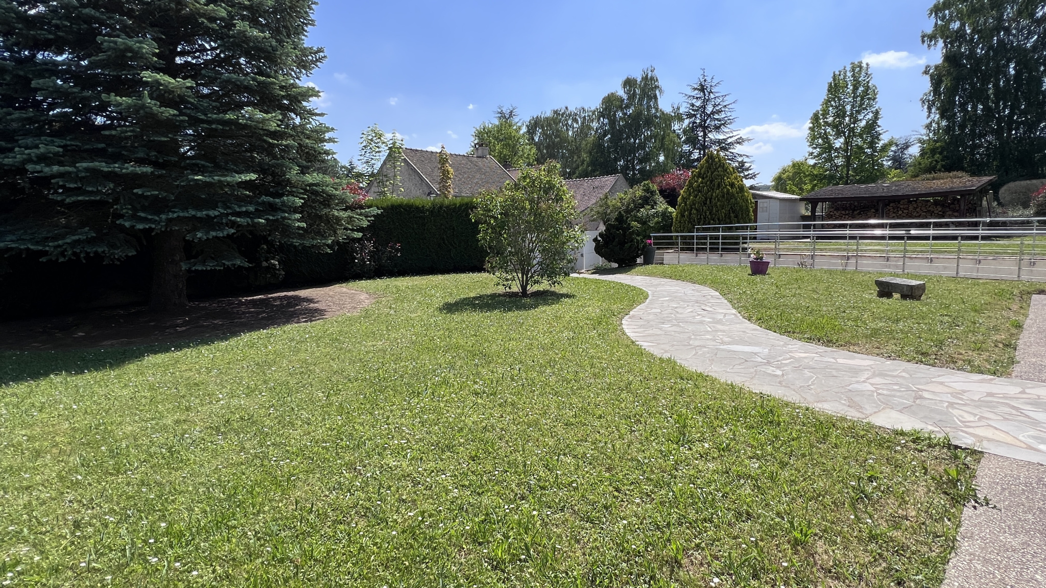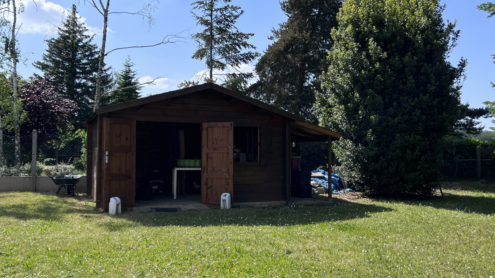 Très beau parc arboré d'environ 1851m2 avec grand abris de jardin (piscinable).