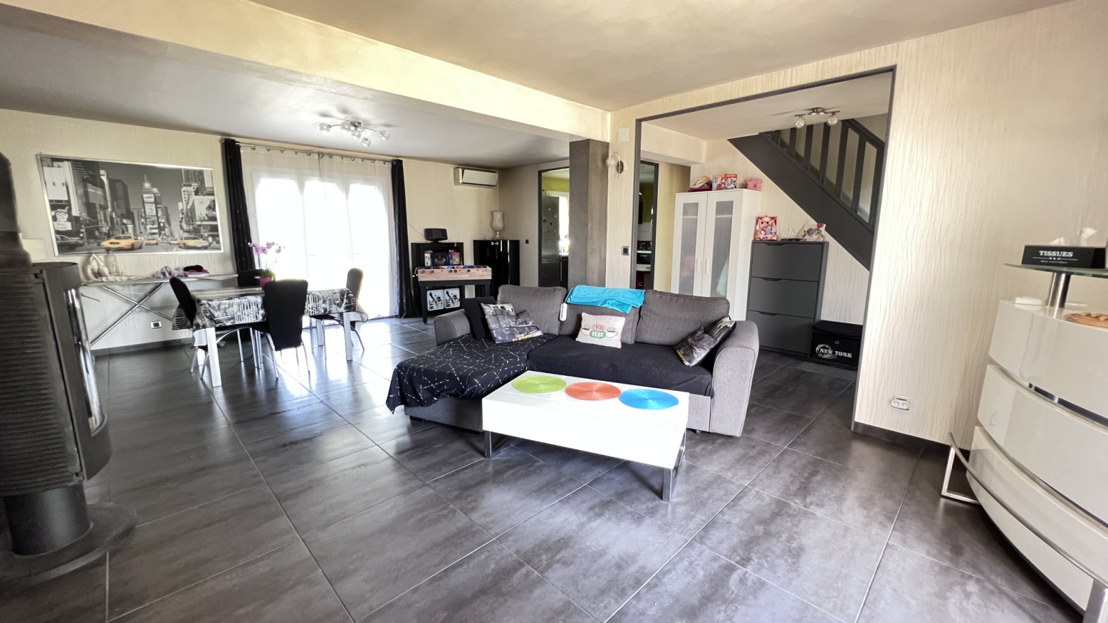 Au rdc, vous disposerez d'une entrée donnant sur salon salle à manger avec poele à bois et accès terrasse extérieure, cuisine us aménagée et équipée, une chambre, salle d'eau et wc séparés.