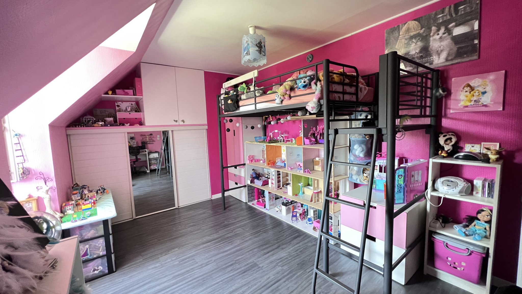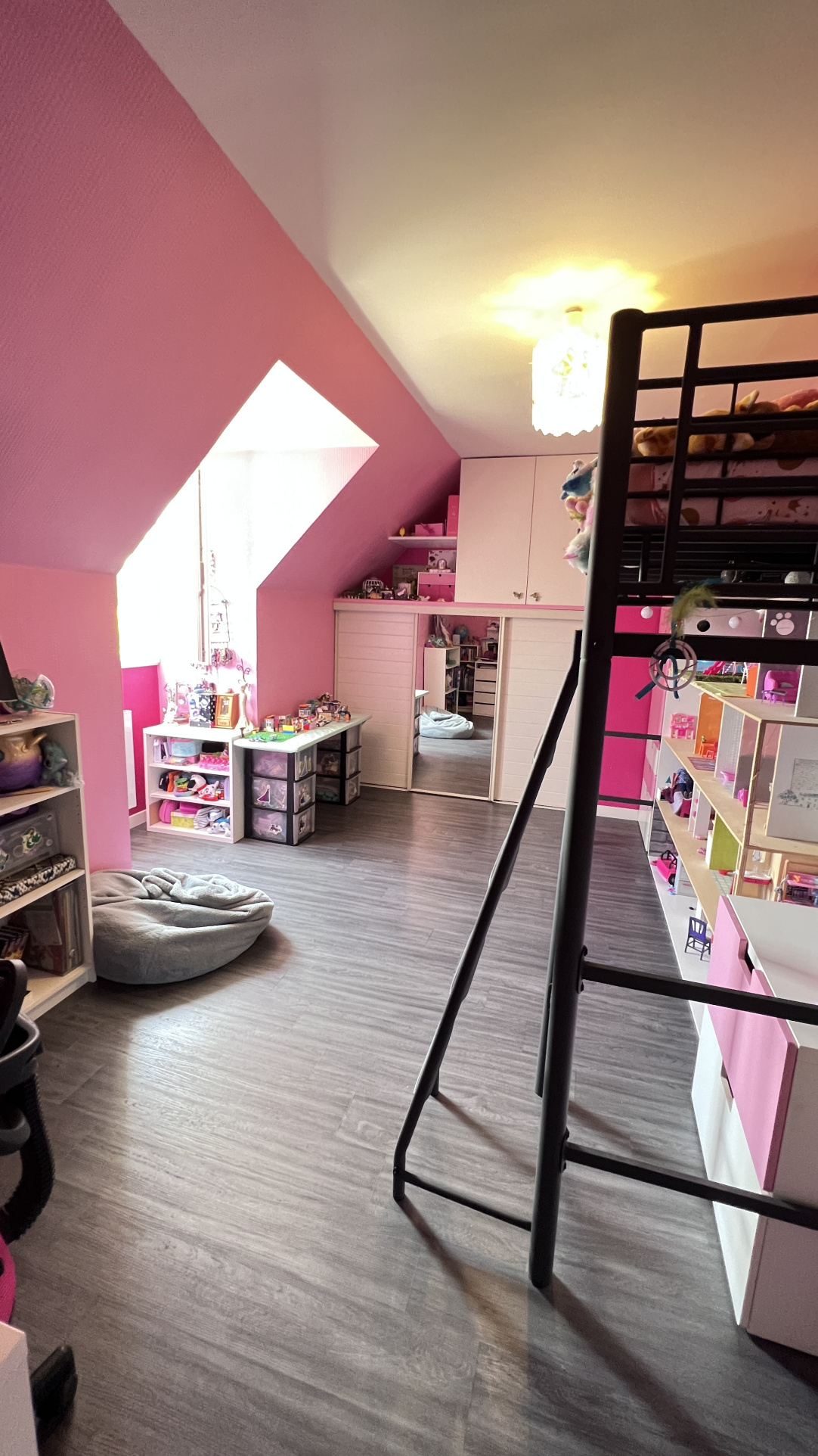 A l'étage (dalle béton) : palier desservant Trois belles chambres, une salle de bains, wc séparés et un dressing.